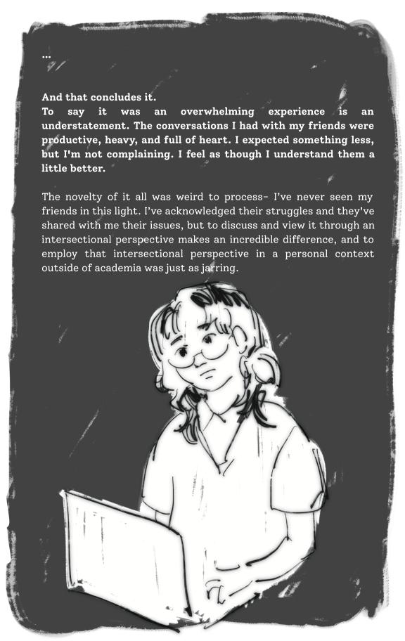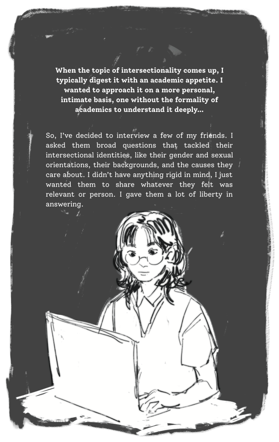 This personal artifact originally started as a short comic where I would broadly introduce my friends to highlight our differences in the context of intersectionality. What began as a small project became something more ambitious and self-indulgent.