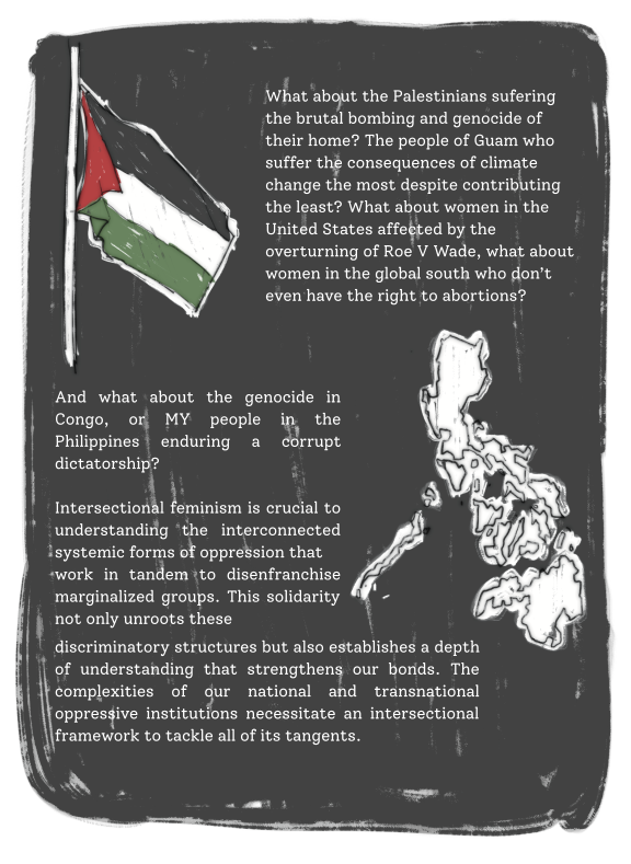 To achieve my feminist utopia, reshaping feminism to include an intersectional framework is the most crucial step. Fortunately, the current wave of feminism has already achieved this. The internet has contributed plenty to spreading information and amplifying the voices of marginalized groups (for example, the worldwide support for Palestine that rallied protests across continents). As helpful as this is, the internet cannot be the only source of information. I believe sociology courses should be mandatory in the curriculums of academic institutions as early as high school. We are perpetually bound to the systemic structures of society that produce the political climates we live in, and to ignore the sociopolitical environment is a privilege. To achieve this, however, our public education system must be reformed so it is properly funded and supported. This approach, ironically, is also under the framework for intersectionality. There is a lot to do, but for now, the internet has radicalized the progressive youth for the better, and it is a huge step towards change.