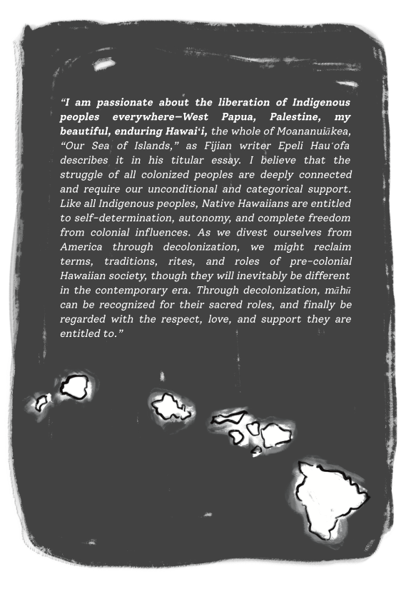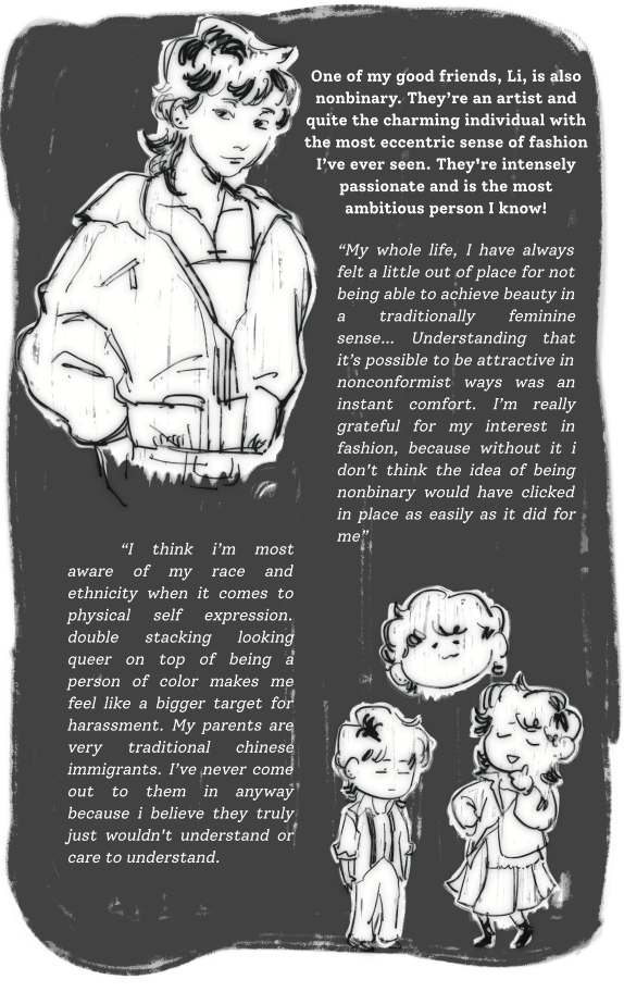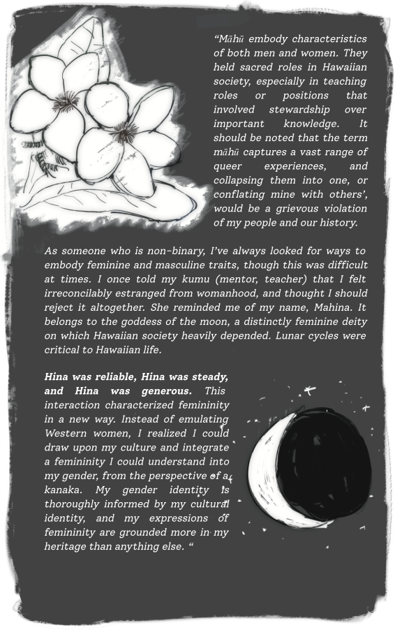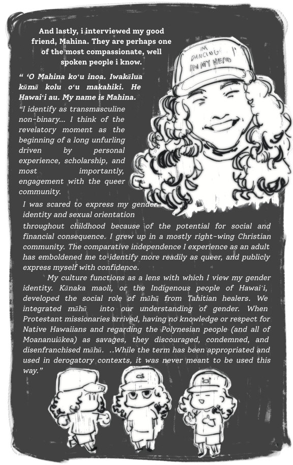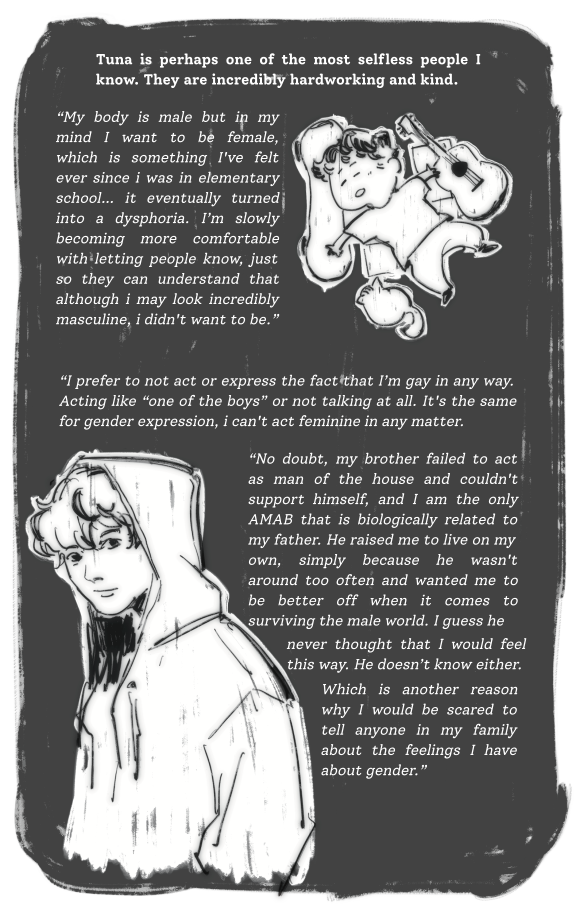 Except for Vatthana, I interviewed all my friends online due to conflicting schedules. This gave them a lot of liberty to type whatever came to mind at their own pace, but I did not expect them to provide paragraphs. Mahina, ever the generous person they are, even went as far as to provide a Google doc where they organized their answers. This changed the trajectory of my project, and instead, I decided to create illustrated text pages. I could not paraphrase their experiences and condense them into comic panels. They were too intimate, vulnerable, and powerful. I directly quoted their responses and excerpts into my work. I let their words dictate my project. The final product is lengthy, but it only covers a small fraction of what my friends have shared.