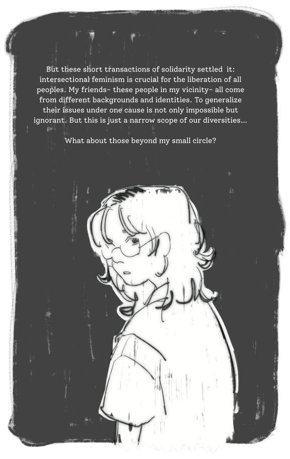 This entire experience changed my outlook on intersectionality. To witness its abstractions and theories manifest themselves in the personal context- in the form of my friends- was something beyond my comprehension. It made the personal political, and I now understand what Audre Lorde meant when she said, “Difference is that raw and powerful connection from which our power is forged." in her work, The Master's Tools will Never Dismantle the Master's House. This is what intersectional feminism is about. The mere acknowledgment of our differences and our struggles creates a comprehension that sparks a radicalization necessary for change. This is the coalition and togetherness that I strive for in my feminist utopia. We cannot operate on tolerance. This political and emotional empathy is what generates momentum towards liberation.
